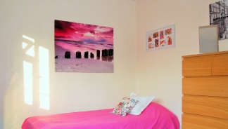 Room 2: Bright room with single bed, desk, bookcase, side table and large wardrobe.